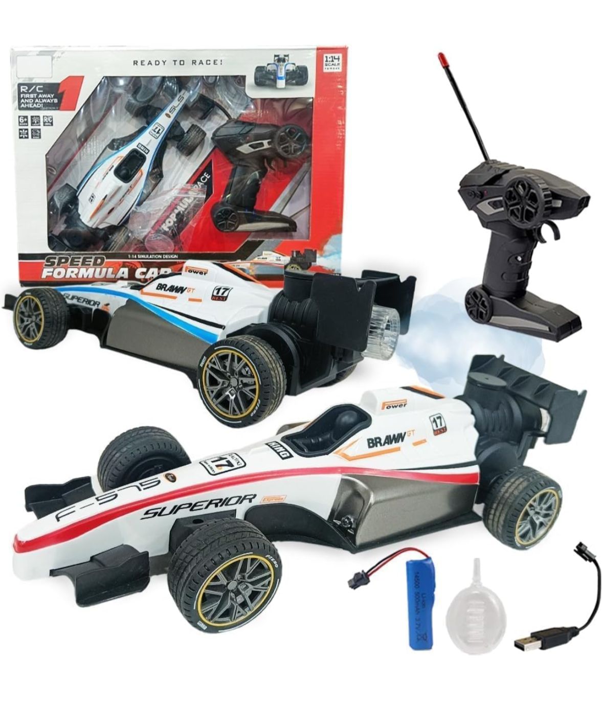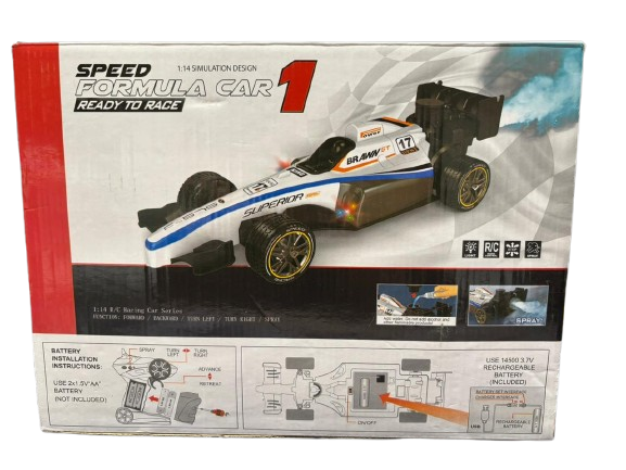 The Formula One RC Car with Spray Function is a high-performance remote-controlled racing car inspired by real Formula One vehicles. Designed for speed, style, and excitement, this RC car features realistic racing design, smooth remote control operation, LED lights, and a unique spray (mist) effect for an immersive racing experience. Powered by a rechargeable battery, it delivers long-lasting fun for kids and RC enthusiasts alike.